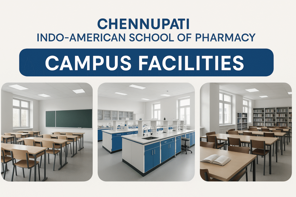 Chennupati Indo‑American School of Pharmacy boasts world-class infrastructure designed to support holistic learning and research in pharmaceutical sciences. The campus features smart classrooms equipped with modern teaching aids, well‑ventilated lecture halls, and high-speed internet connectivity, ensuring a seamless learning experience. Our state-of-the-art laboratories, including pharmacology, pharmaceutical chemistry, and biotechnology labs, provide hands-on training and encourage innovation in drug development and clinical research. The library houses an extensive collection of textbooks, journals, and digital resources, offering students and faculty easy access to the latest knowledge. Comfortable hostels, recreation areas, and dining facilities create a supportive and vibrant environment for students from diverse backgrounds. By combining advanced educational facilities with a focus on safety, hygiene, and sustainability, the infrastructure at Chennupati Indo‑American School of Pharmacy empowers students and faculty to excel academically, engage in cutting-edge research, and prepare for successful careers in the global pharmaceutical industry.