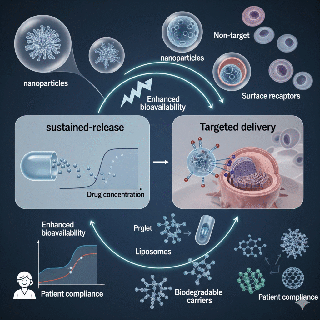 Research on nanoparticles, liposomes, and biodegradable carriers.